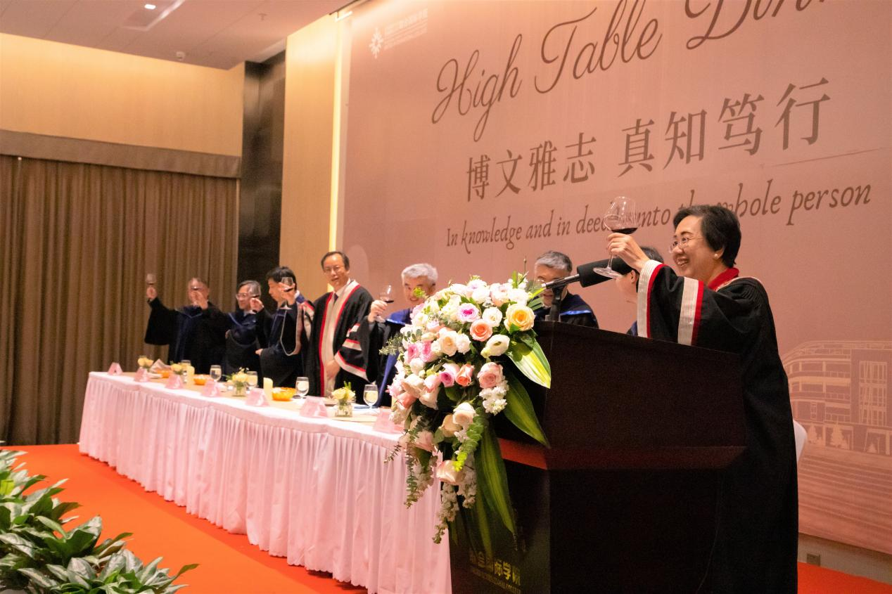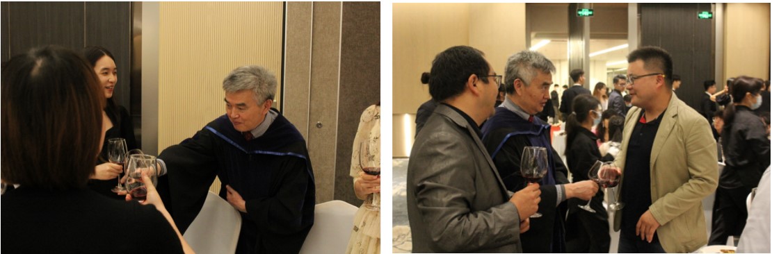 高桌晚宴在美酒佳肴中持续,晚宴主席左龙佩兰教授带领师生们祝酒,嘉宾们与在场师生共同举杯,一祝全场师生前程似锦,二祝我们的学校越办越好,三祝我们的国家繁荣昌盛,人民安居乐业。笑语盈盈,气氛热切,晚宴在欢声笑语中结束。