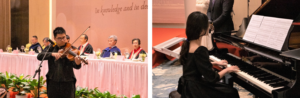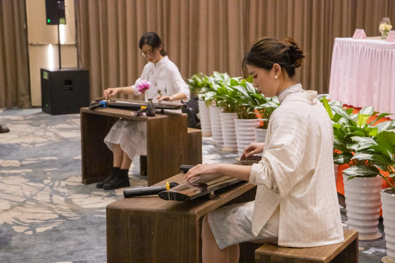 左龙佩兰教授向郭世佑教授赠送纪念品,感谢他对UIC通识教育的支持。接着,师生们一起欣赏了由UIC学生彭雅薇,屈玮婷带来的源自《诗经·小雅·鹤鸣》的古琴重奏《鹤鸣九皋》和梁嘉芮、刘咏图两位同学表演的钢琴、中提琴合奏《天鹅》,该曲由法国作曲家夏尔·圣桑创作。同学们的精彩演出体现了中西文化的融合,为高桌晚宴增添了优雅的艺术气息。