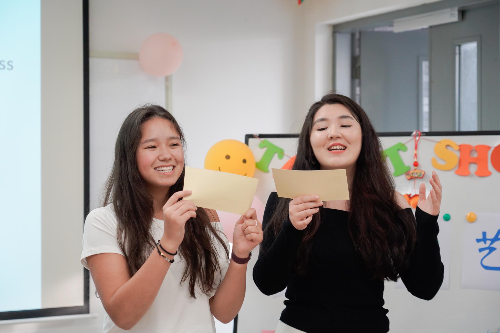 CLCC teacher and course convener Dr. Jenny Cui (left) presents the Lucky Draw 1st Place Prize to international student Nil Rana Colakoglu (right) from Turkey