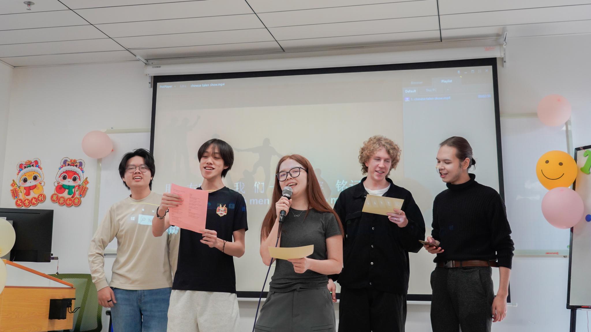 The event, held in a lively and festive atmosphere, has shown the impressive linguistic and cultural achievements of exchange and international students enrolled in Chinese language courses. Hosted by Ms. Angela Liu from CLCC and Claudia Gandini from Intermediate Chinese I, the show included some exciting activities such as stage comedy, pitch-pot, Chinese song performances, and charades.