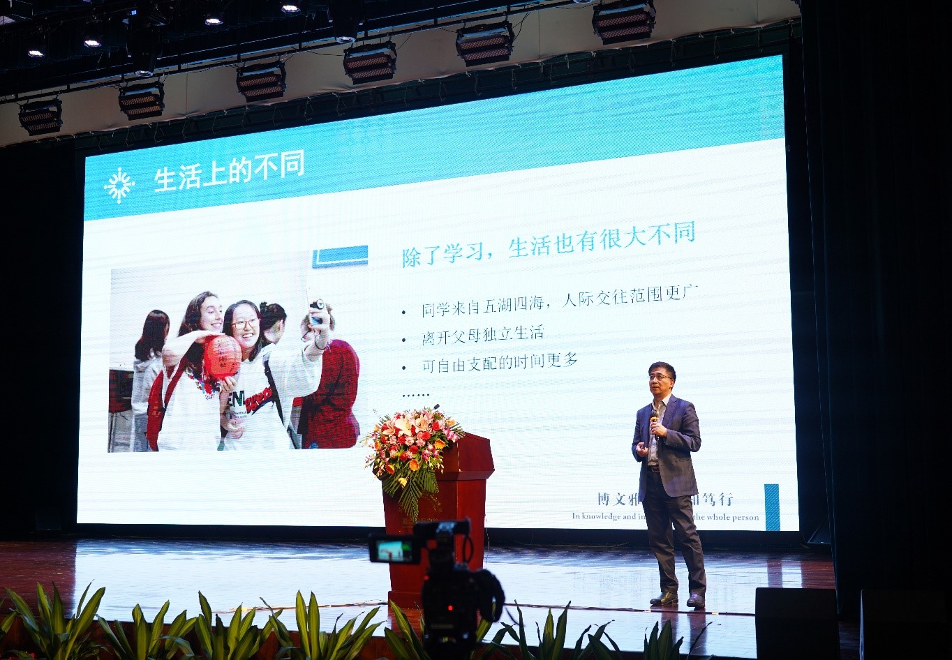 讲座伊始,汤校长首先对新同学们的到来表示欢迎,并介绍了这次讲座将从“推开大学之门——从高中步入大学”,“走在大学之路——在UIC的独特体验”和“目向大学之旨——站在巨人的肩膀上”三个方面展开。