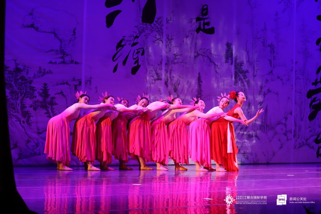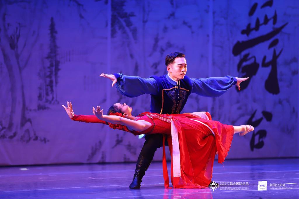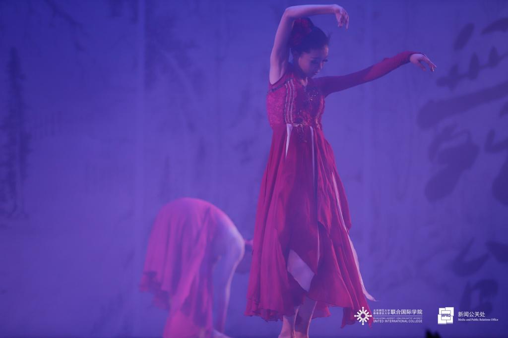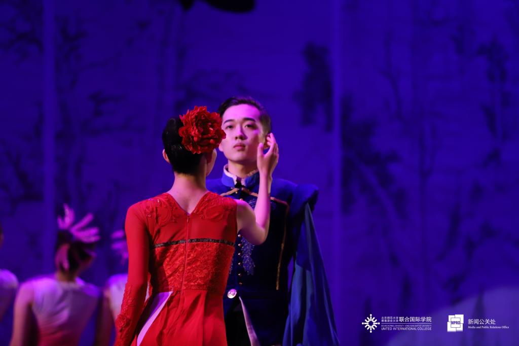 在悠扬唯美的舞台意境中,序幕拉开,穿戴昆曲戏服的杜丽娘和身着红色舞蹈长裙的朱丽叶开始了她们爱情故事的讲述。《杜丽娘与朱丽叶》这一戏剧最大限度地使用现代舞作为两种戏剧之间的动作贯串要素,在肢体语言上实现了顺畅衔接。主要舞蹈演员来自中国戏曲学院,扮演罗密欧(话剧部分)和汤显祖、莎士比亚的是4位UIC的男同学,同时共有13位来自UIC的女同学作为舞蹈演员,分别在民族舞和现代舞两个部分完成了全场配舞。