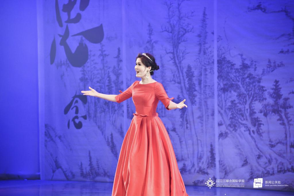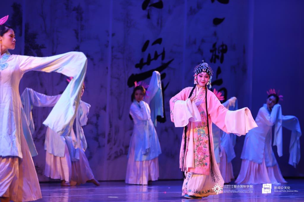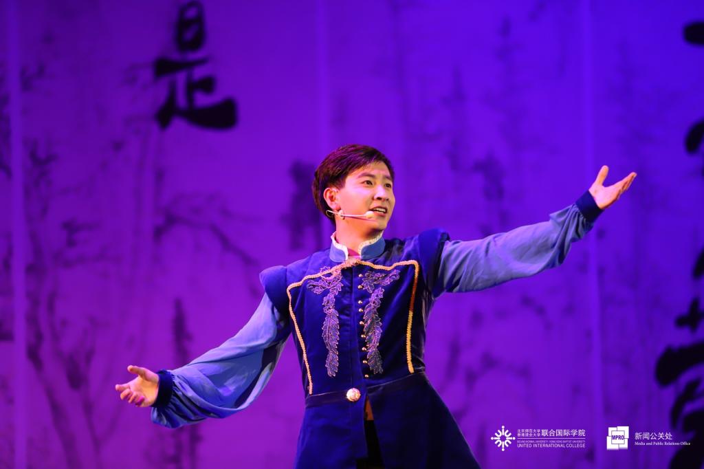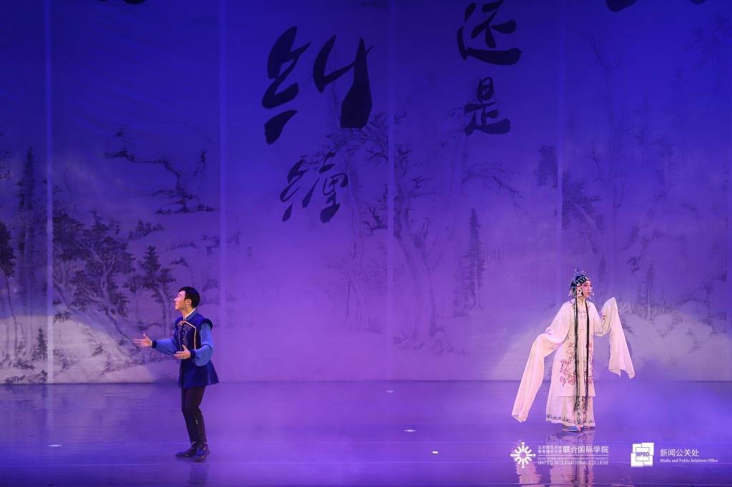 UIC校长吴清辉教授为演出致辞。他介绍到,跨界戏剧《杜丽娘与朱丽叶》是为了弘扬中华优秀传统文化,促进中西文化的对话和交流,丰富珠海高品位的文化生活,由UIC中国语言文化中心与北京外国语大学艺术研究院共同策划、两校师生共同编排的。“这是一部别开生面、充满想象力和创意精神的剧作,它融戏曲、舞蹈和话剧为一体,以全新的视角,带领我们穿越浩瀚的时空,重新领略杜丽娘与朱丽叶两位女主人公内心的情感世界。这部戏的编剧甚至还添加了剧作人与剧中人对话的情节,充分展示了我们这个创新时代的特征:跨界、融合,以多元化、多方位的手法演绎经典。”