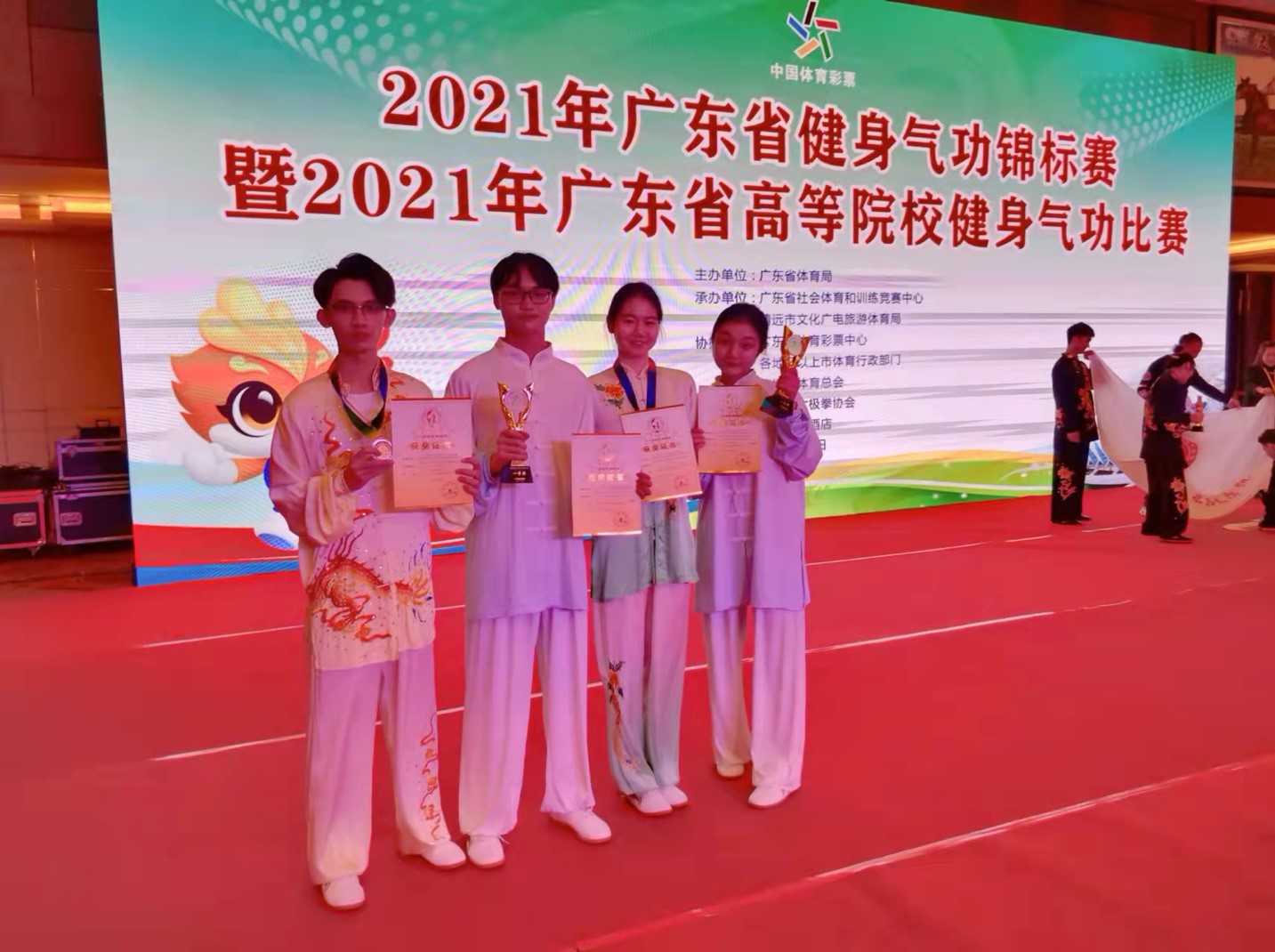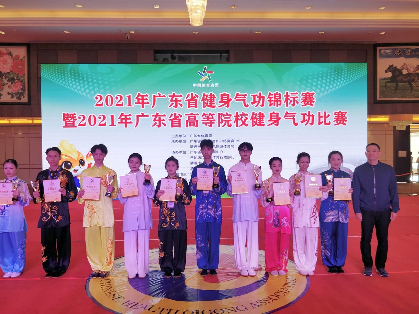 2021年12月11日至12日,北师港浸大(UIC)健身气功校队参加了由广东省体育局主办、清远市文化广电旅游体育局承办的2021年广东省健身气功锦标赛暨2021年广东省高等院校健身气功比赛。本次省赛共有26支参赛队伍、共176名队员参加。北师港浸大(UIC)健身气功校队在健身气功大舞和太极养生杖两项集体项目中皆荣获一等奖。同时,我校健身气功校队在个人项目上也斩获佳绩,大一统计学专业的夏语笛获易筋经竞赛功法第一名,大一工商管理学系的曾嘉乐获六字诀竞赛功法第二名。