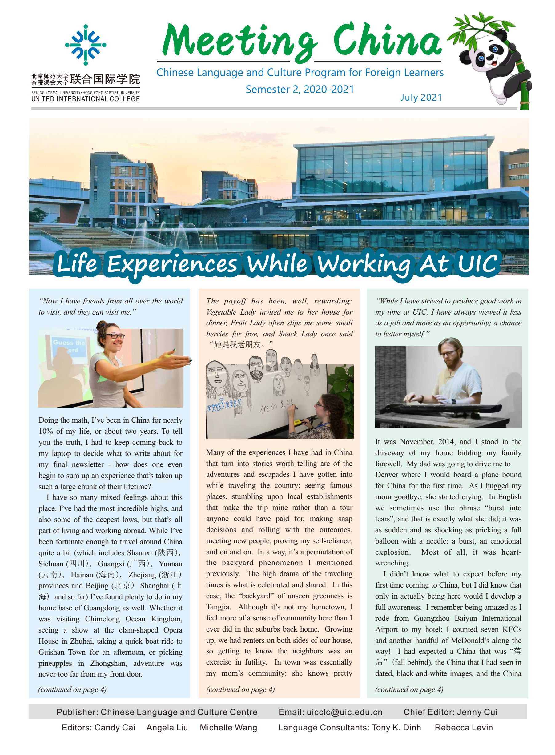 It presents Chinese cultural knowledge and learners' sharing from the second semester of 2020-21 in the Chinese Language and Culture Program for Foreign Learners. You will find Life experiences while working at UIC from the perspectives of interns and teacher, Chinese language learning experience sharing, Travel destination recommendations, and My travel journal from our international students, and more.