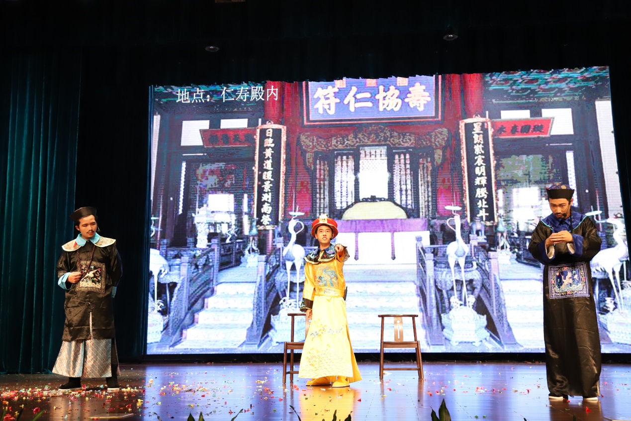 首先登台表演的是大一IJ专业“奶奶的温暖学社”,他们的作品名为《孔子育礼》。故事灵感来自《论语》中“子见南子”章。通过与南子对话,孔子阐发了他有关“礼”的思想:《诗三百》的精华在于其展现人天性时的自然、坦荡,但人和走兽的区别正是人能用礼约束自己行为。乱世之中,以礼治国,才能使天下安定。评委冯瑞龙老师表扬该作品改编有创意,且饰演“孔子”的演员表演出色,很有“圣人”风范。