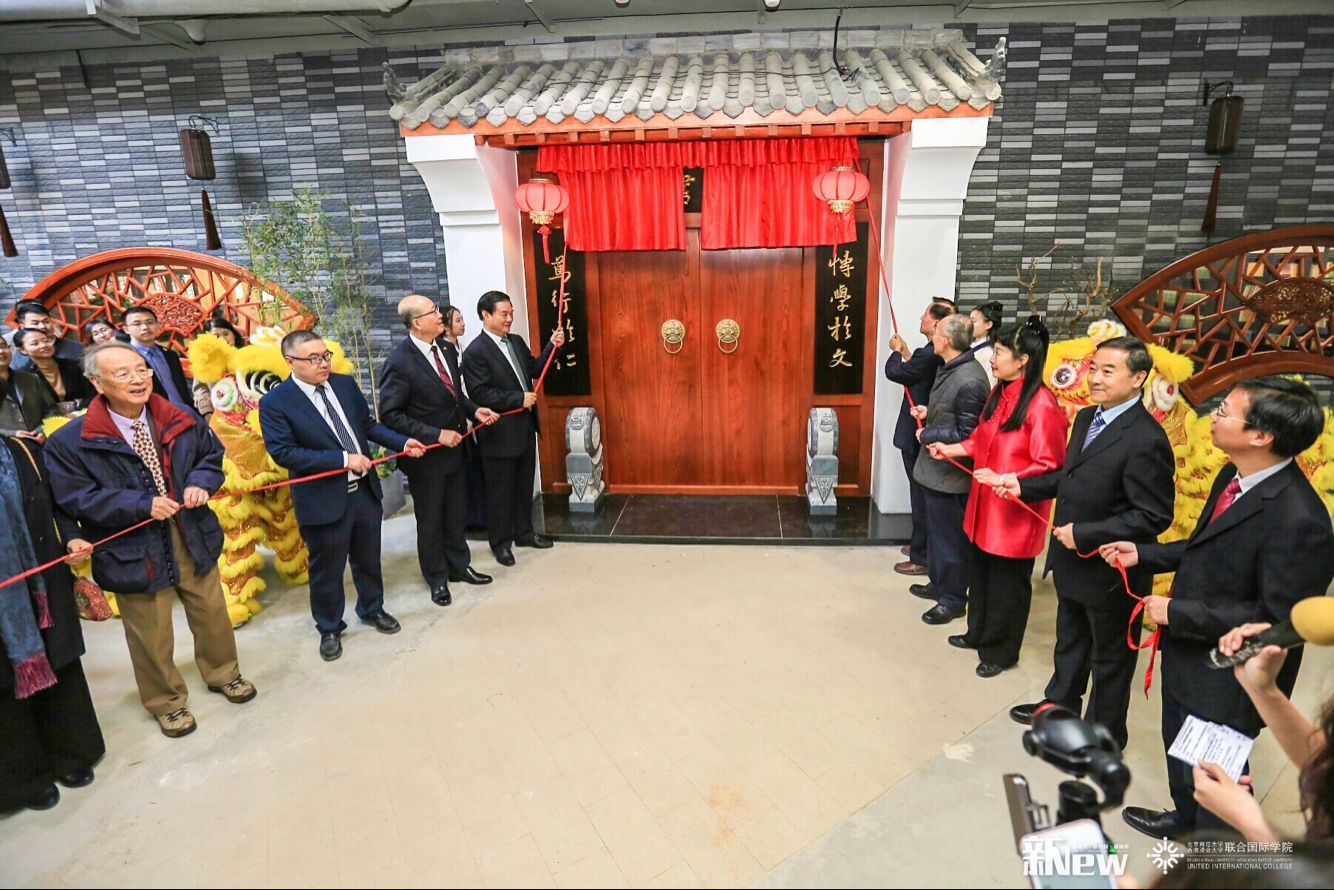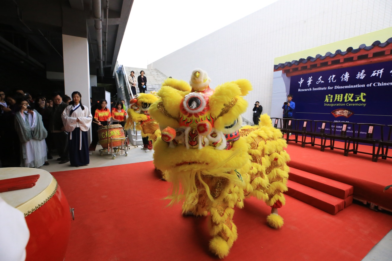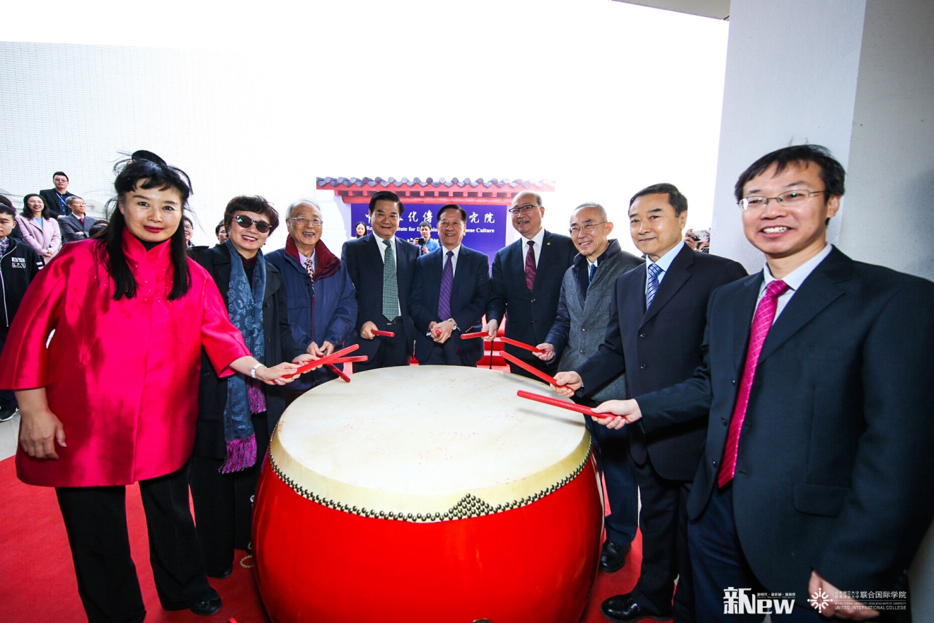 致辞环节后,所有嘉宾移步至研究院大门。联合国际学院校长、中华文化传播研究院常务副院长吴清辉,上海华信公益基金会执行理事长李光金,北京大学人文讲席教授陈鼓应,中国华信能源有限公司副总裁陈强,联合国际学院副校长徐是雄、张聪,国家一级演员孙萍,叶金森,中国文化院(香港)总经理吴建芳和中华文化传播研究院秘书长伍鸿宇担任击鼓启门的主礼嘉宾。主礼嘉宾共同击鼓三通后,研究院应声启门,中华文化传播研究院至此正式启用。