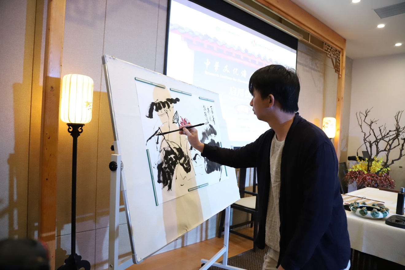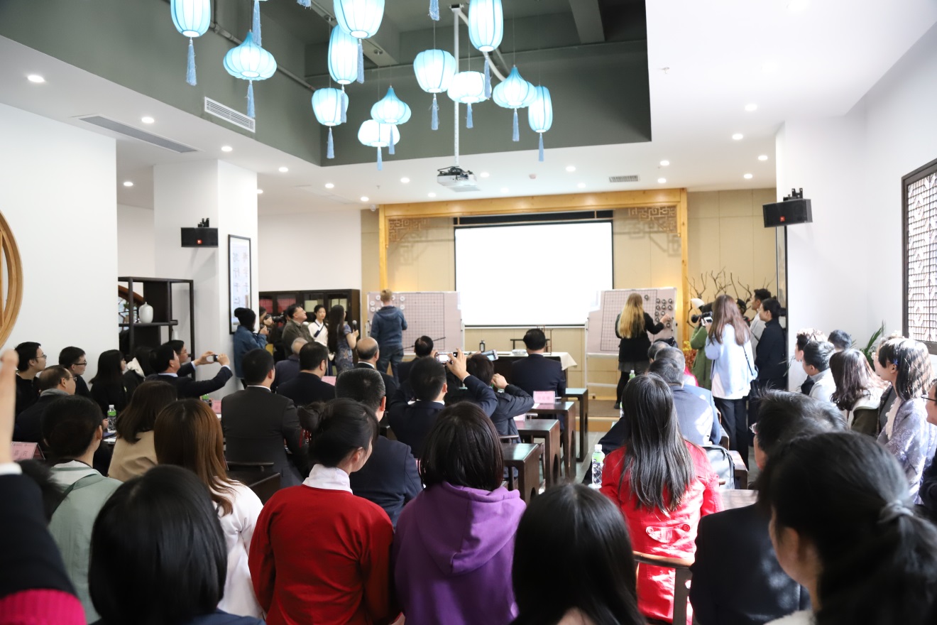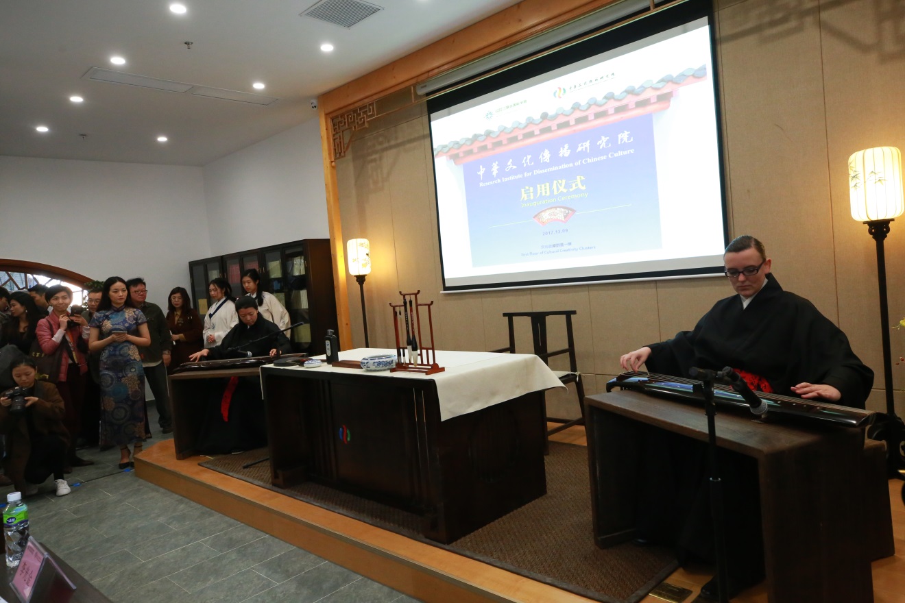 华信书院揭牌后,嘉宾与学生落座书院讲堂。为呼应中华文化传播研究院的主题, UIC师生和与会嘉宾共同带来“琴棋书画”的文艺展示。艺术中心李曼老师与来自美国的助教Jenna合奏古琴《曲水流觞》,是为“琴”;英语中心的Jacob 与Brittany以字为棋博弈,拼出研究院和书院的楹联——“传承千载,播扬四海”、“博学于文,笃行于仁”,是为“棋”;著名京剧表演艺术家、国家一级演员、2017华信驻校艺术家叶金森为研究院现场题字,是为“书”;谢锦麟老师即兴挥毫,以写意荷花的画作寓意中华传统文化中的 “天下一家”的包容, 是为画。