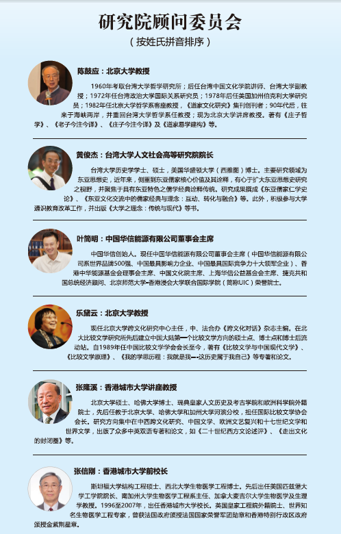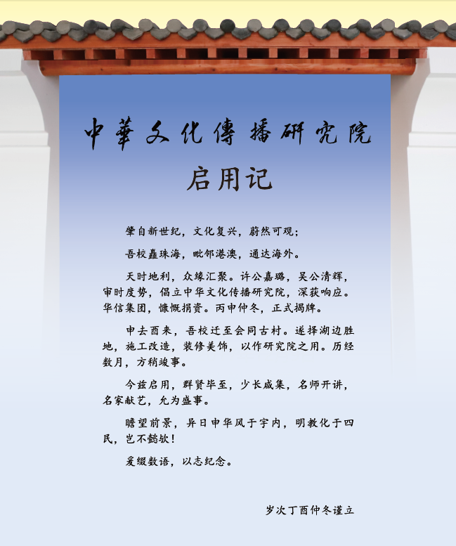 中华文化传播研究院成立于2016年,由海内外六位著名学者担任顾问委员会和九位学者担任学术顾问。研究院旨在立足当代中国社会现实,通过多种形式创造性地开展教学与研究活动,培养具有家国情怀与传统文化素养的国际化优秀人才,为推动中华文化全面复兴而努力。同时,研究院还得到来自社会的支持,中国华信捐资修建的华信书院也于12月9日正式揭牌。