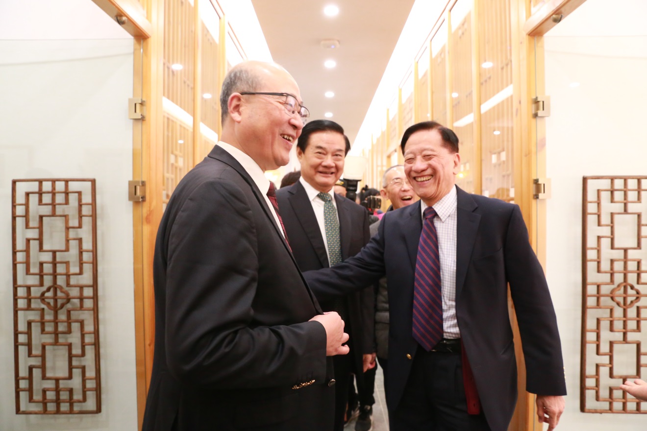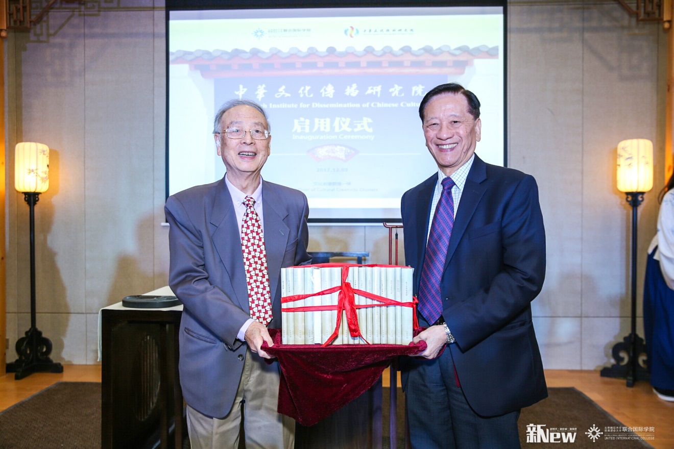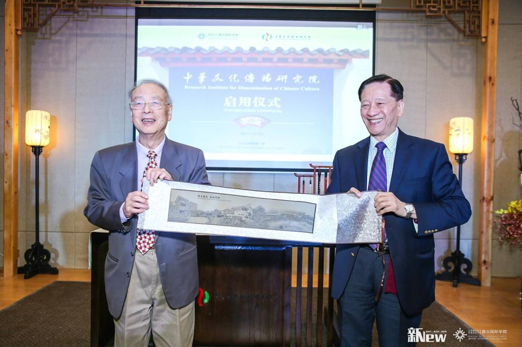 北京大学陈鼓应教授作为首届“华信杰出学者”,为庆祝中华文化传播研究院启用,将自己所著的二十册(十五册)文集赠与书院,吴清辉校长回赠UIC新校园画轴。