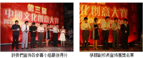 在歷時兩個多小時後,第三屆中國文化創意大賽圓滿落幕。張聰副校長宣佈大賽結果:《地府土地競標會》、《雙城記》和《霍小玉傳》分別獲得一、二、三等獎,《杯酒釋兵權》、《青蛇傳》、《戰國運動會》等三個節目獲得優秀獎。