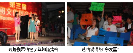 一個個精彩的演出不時博得觀眾的陣陣掌聲和喝彩,而節目之間的互動環節--有獎搶答和投票抽獎,更是讓臺上台下的互動達到高潮。與前兩屆大賽不同的是,此次大賽新設立了"學友團",為各自支持的節目助威呐喊。臺上精彩不斷,台下熱情高漲,整個賽場氣氛十分熱烈。