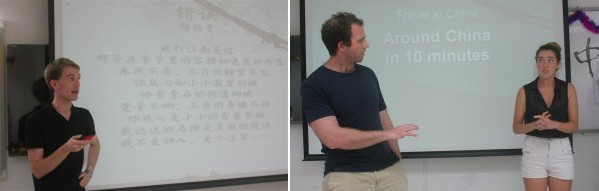 Geoffrey Marschall, Elise Reysbergen和Keenan Madson分别来自CTV和ELC,同时也是“旅游汉语”班级的学生,他们为大家带来了电视秀《十分钟游中国》。在短短的时间内他们用中英文介绍了中国四个具有代表性的城市:哈尔滨、大理、上海、成都,节目最后Geoffrey更是激动地说:“我有个游遍中国的梦想,下一次一起出发吧!”