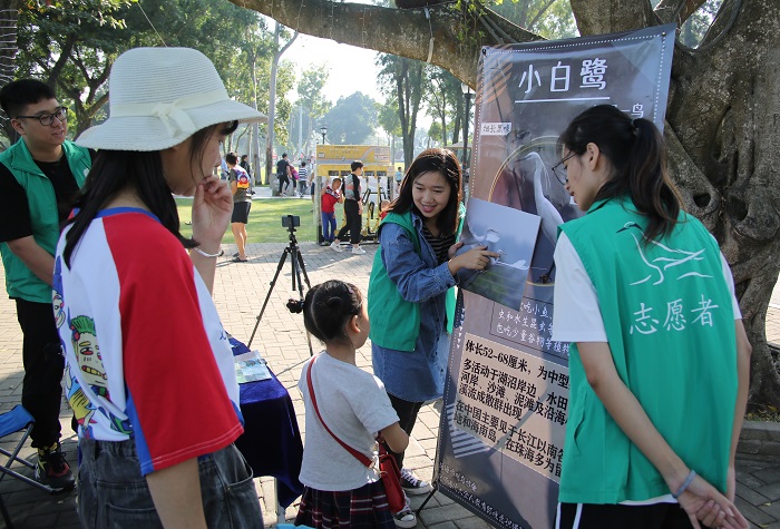 除了传授观鸟及鸟类保护的专业知识外,课外同学们也走出校园,参与鸟类保护实践活动。11月是全国“野生动物宣传月”,观鸟课的同学们也与珠海市观鸟协会合作,开展珠海市常见鸟类宣传活动,为市民科普鸟类知识,使更多人参与到动物保护的行动中来。