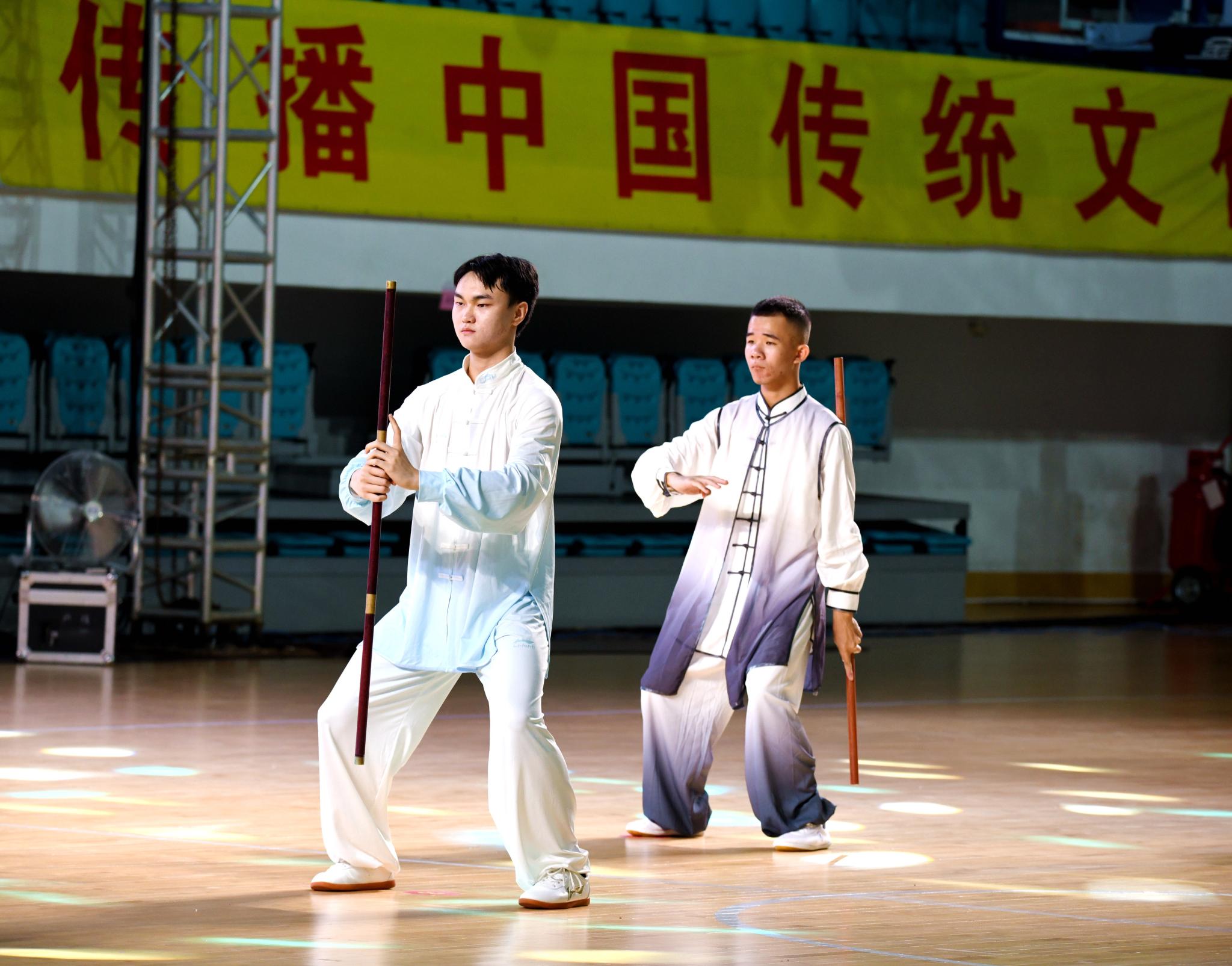 李博文同学在健身气功·太极养生杖比赛中展示