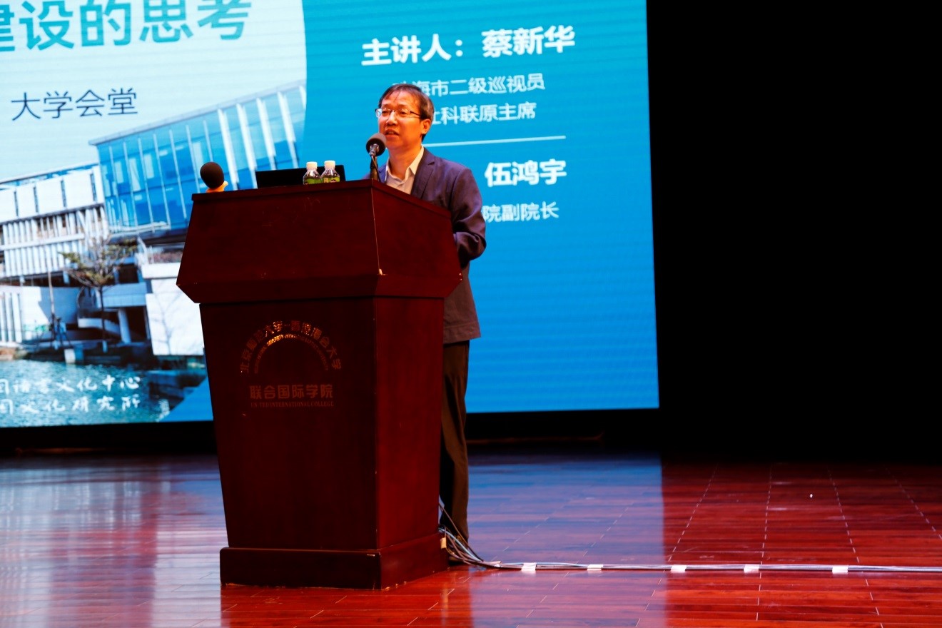 2023年10月18日下午,“形势与政策”系列讲座第七十九讲于大学会堂准时开讲。本次讲座由珠海市二级巡视员、市社科联原主席蔡新华先生主讲,题目为《珠海历史概述与文化内涵建设的思考》。UIC通识教育学院副院长伍鸿宇教授主持了本次讲座。
