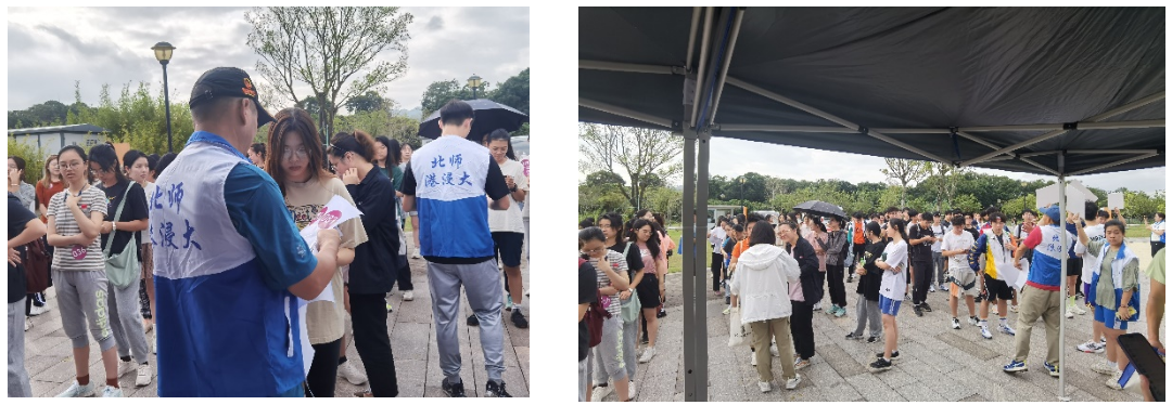 测试准备现场组织有序,参加抽测的学生集中后由“小蓝衣”引导员分组进行签到和指引,随之由体育老师带队前往田径场做准备运动。