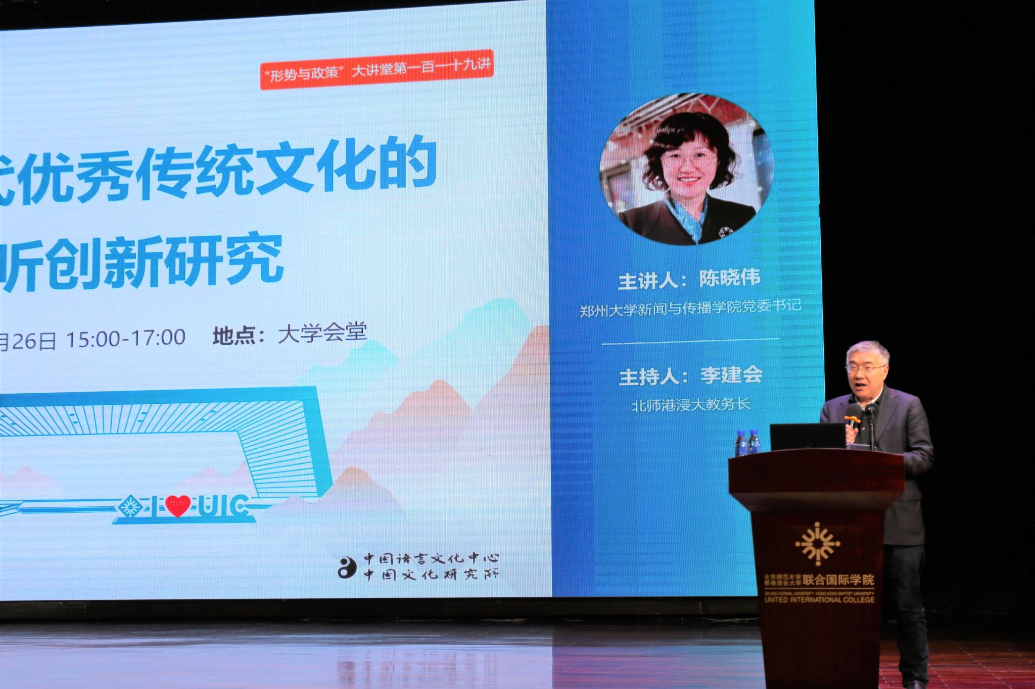 2025年2月26日星期三下午三点,北师港浸大“形势与政策”大讲堂第一百一十九讲准时开幕,师生齐聚大学会堂,共同聆听由郑州大学新闻与传播学院党委书记陈晓伟教授为大家带来的精彩演讲。本次演讲的主题为“数智时代优秀传统文化的视听创新研究”。讲座由校教务长李建会教授主持。