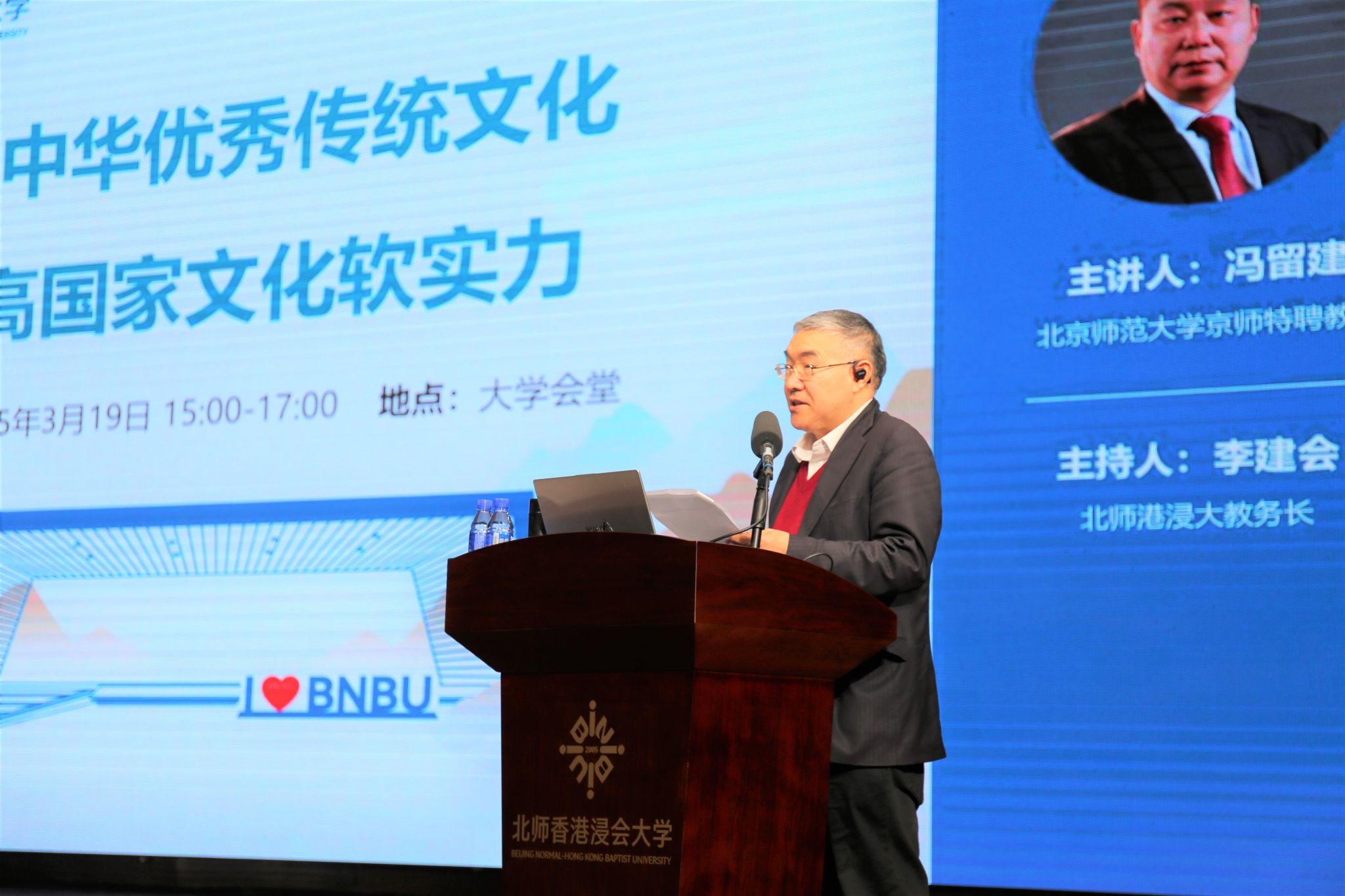 2025年3月19日下午三时,北师港浸大“形势与政策”大讲堂第123讲在我校大学会堂如期举行,讲座由北师港浸大教务长李建会教授主持,主讲嘉宾是北京师范大学京师特聘教授冯留建博士,他演讲的题目为“弘扬中华优秀传统文化 提高国家文化软实力”。我校师生齐聚一堂,聆听了冯教授的精彩演讲和深刻见解。