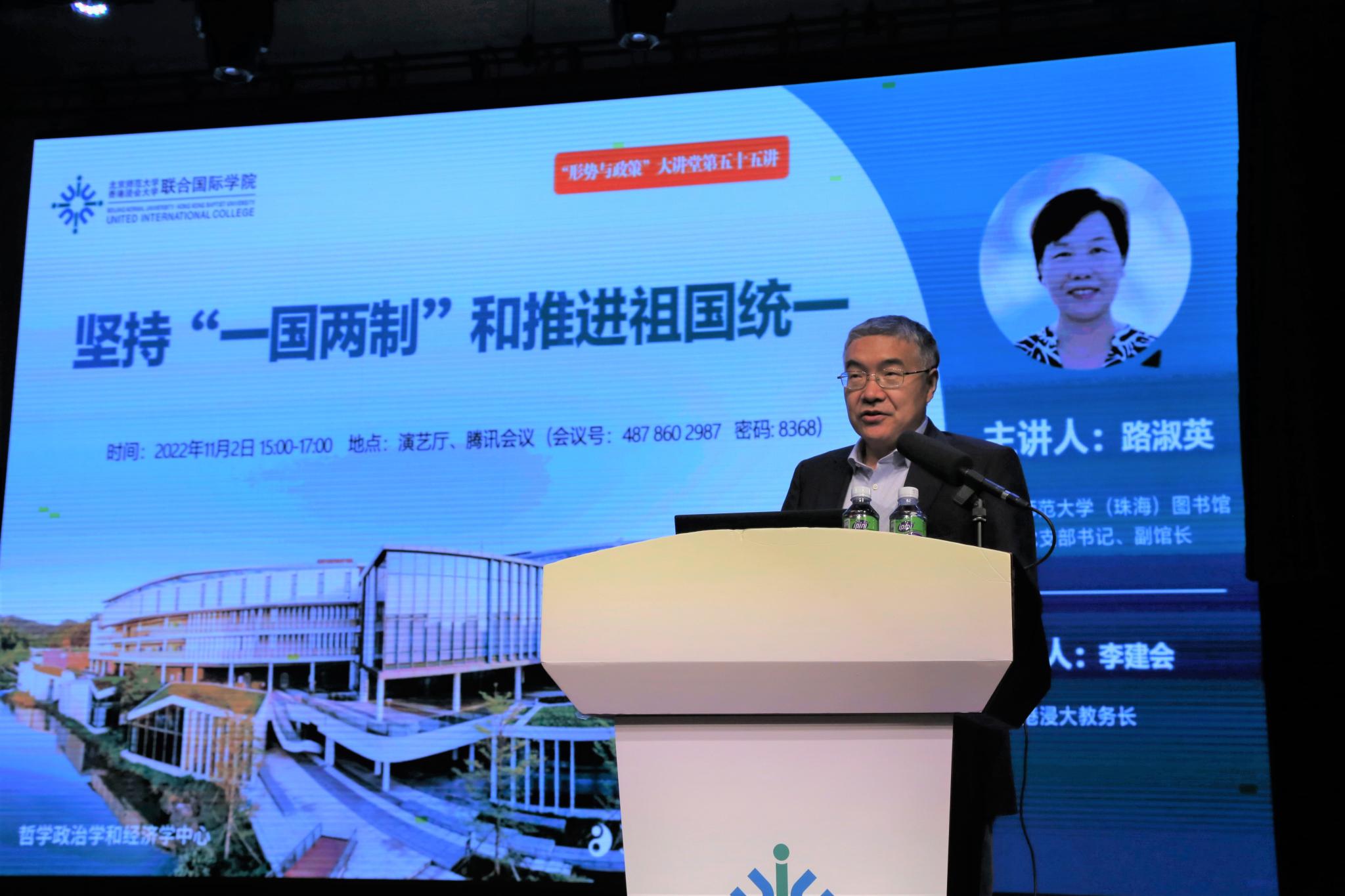 2022年11月2号下午,北京师范大学(珠海)图书馆直属党支部书记、副馆长路淑英教授应邀为UIC学子们带来了一场内容丰富、发人深省的“形势与政策”讲座,讲座的主题是“坚持‘一国两制’和推进祖国统一”。本场讲座由北师港浸大教务长李建会教授主持。