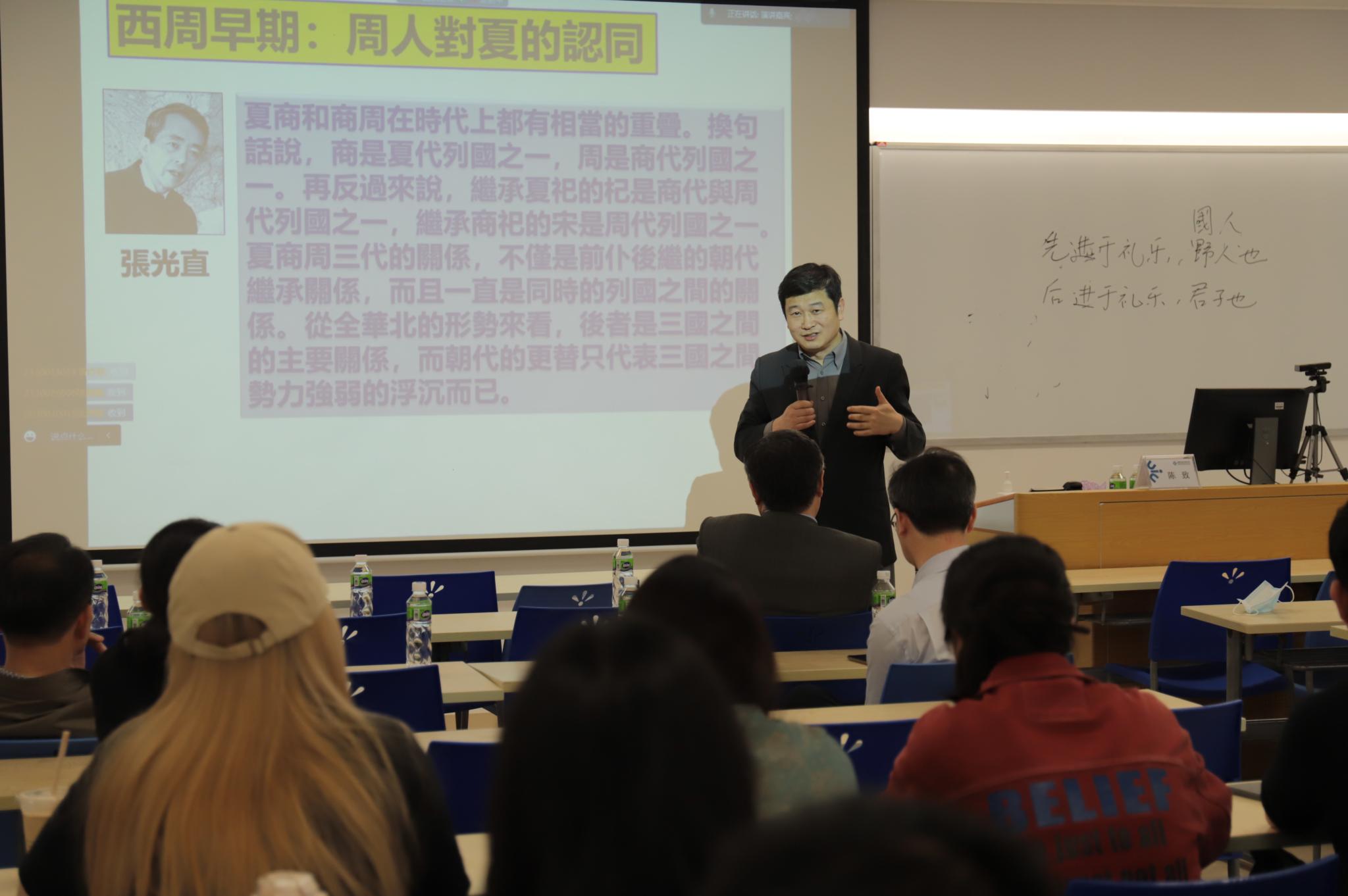 《史记·孔子世家》有言:“诗三百,孔子皆弦歌之。”说明自古就有诗乐一体之传统。然而,乐从何起?便要追溯雅乐的滥觞了。在了解雅乐的源头之前,陈教授为同学们梳理了夏商周三代的关系。傅斯年在《夷夏东西说》《周东封与殷遗民》等著作中认为,夏商周三代兼具时间和空间的交叉性。哈佛大学考古学家张光直教授在傅斯年的理论和其它考古学证据的影响下提出:“夏商周这三代的关系,不仅是前仆后继的朝代关系,而且一直是同时的列国之间的关系”。实际上早期文献中并没有清晰的夏商周的区分,西周时期的文献记载中,周人也常以夏自居,如《君爽》中周公言:“惟文王尚克修和我有夏”。周人为何自称为夏?对此学界有不同的说法:一说是由于婚姻关系,也有说周本为地名,古公亶父迁居于此,取地名为部族名,而夏是最初的部族名。在陈致教授看来,周人以夏自居的真正原因是为了“争正统”。《尚书·立政》言:“帝印罚之(殷),乃伻(抨)我有夏,式商受命,奄甸百姓。”也即是说,面对比自己强大的商,周人出于某种政治上的需要而认同夏。以夏自居,不仅使各方面处于劣势的周人寻找到了一种精神上乃至政治上可以与殷人相抗的依据,从夏人那里承袭的“夏乐”也具有音乐之上的某种民族文化象征意义。正因为如此,周人在灭商后,并没有全盘接受殷人的音乐文明,所以在周代的雅乐中便有文乐“大夏”和武乐“大武”之分。