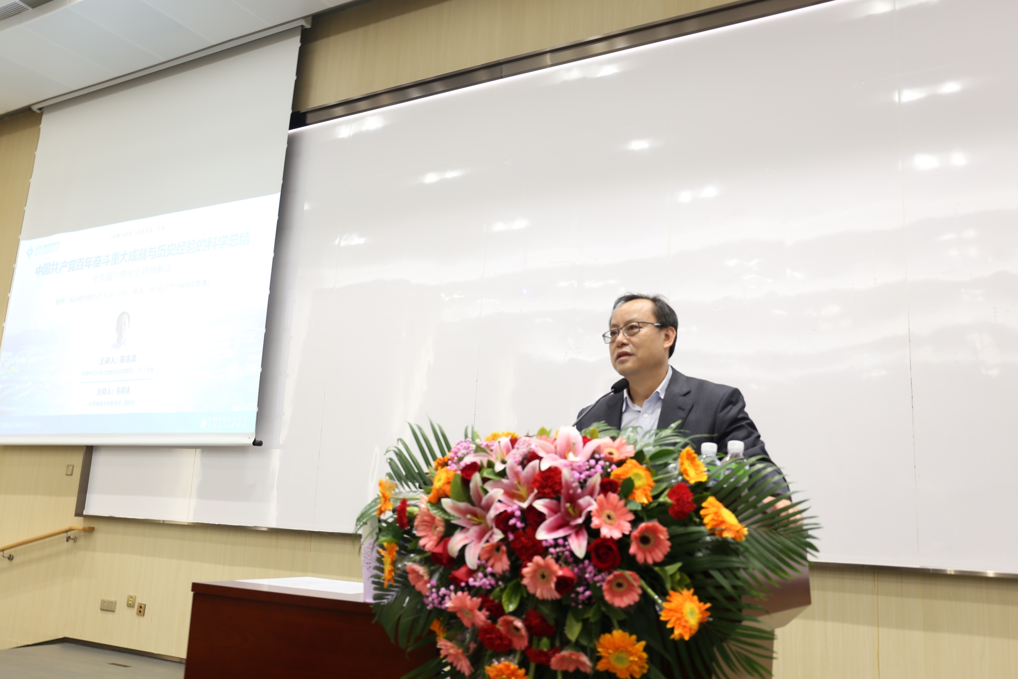 为了学习贯彻党的十九届六中全会精神,11月25日下午,华南师范大学马克思主义学院院长、长江学者陈金龙教授受邀给全校师生和党员同志带来了主题为《中国共产党百年奋斗重大成就与历史经验的科学总结》的讲座,为大家解读十九届六中全会精神。本次讲座由我校党委书记、副校长毛亚庆教授主持。