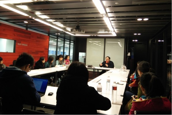 此次“台湾文学之旅”最后一场文学讲座安排在台北一个很现代的会议室里,与我们分享文学创作经历的是台湾著名小说家骆以军先生。骆先生的小说作品情节设置大胆,充满想象,用词造句具有很强的个人特色,这些在他的言语之中也得以体现。