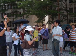 我们抵达新竹清华大学的时候,台湾的蒲彦光老师、叶千翡老师早早地等候在清华大学门口,还为大家带来了新竹的名产--柿子饼。与北京的清华大学一样,这里的清华校园古朴、自然,没有华丽的大楼,惟有宁静的树林与湖水。看来两地的清华大学都继承了老校长梅贻琦先生的思想:大学者,非大楼之谓也,乃大师之谓也。