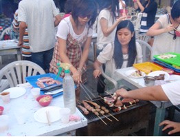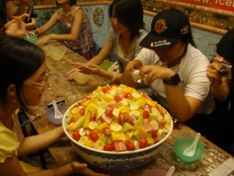 台湾每个地方几乎都有特色菜品。我们在台北吃过美味的阿美担仔面,店面虽小,但味道堪称一绝,连店内的装饰也别具一格。在新竹品尝过叶千翡老师和蒲彦光老师带来的"风城"柿子饼,是一种里面包着柿子肉的Mochi,味道很独特。在嘉义吃过火鸡饭,搭配的菜品同样很有味道,吃得大家食量大开。在日月潭畔的酒楼上吃过非同寻常的"总统鱼"。在垦丁亲身体验过恒春烧烤的风味。在高雄吃过地道的涮涮锅,也体验过冰沙店的魅力。我们在名为大碗公的冰沙店一饱口福,不仅冰沙冰凉爽口,盛放冰沙的碗之大也令人赞叹。20多人把直径约80厘米大的一碗冰沙吃的净光,同学们食冰的热情高涨。